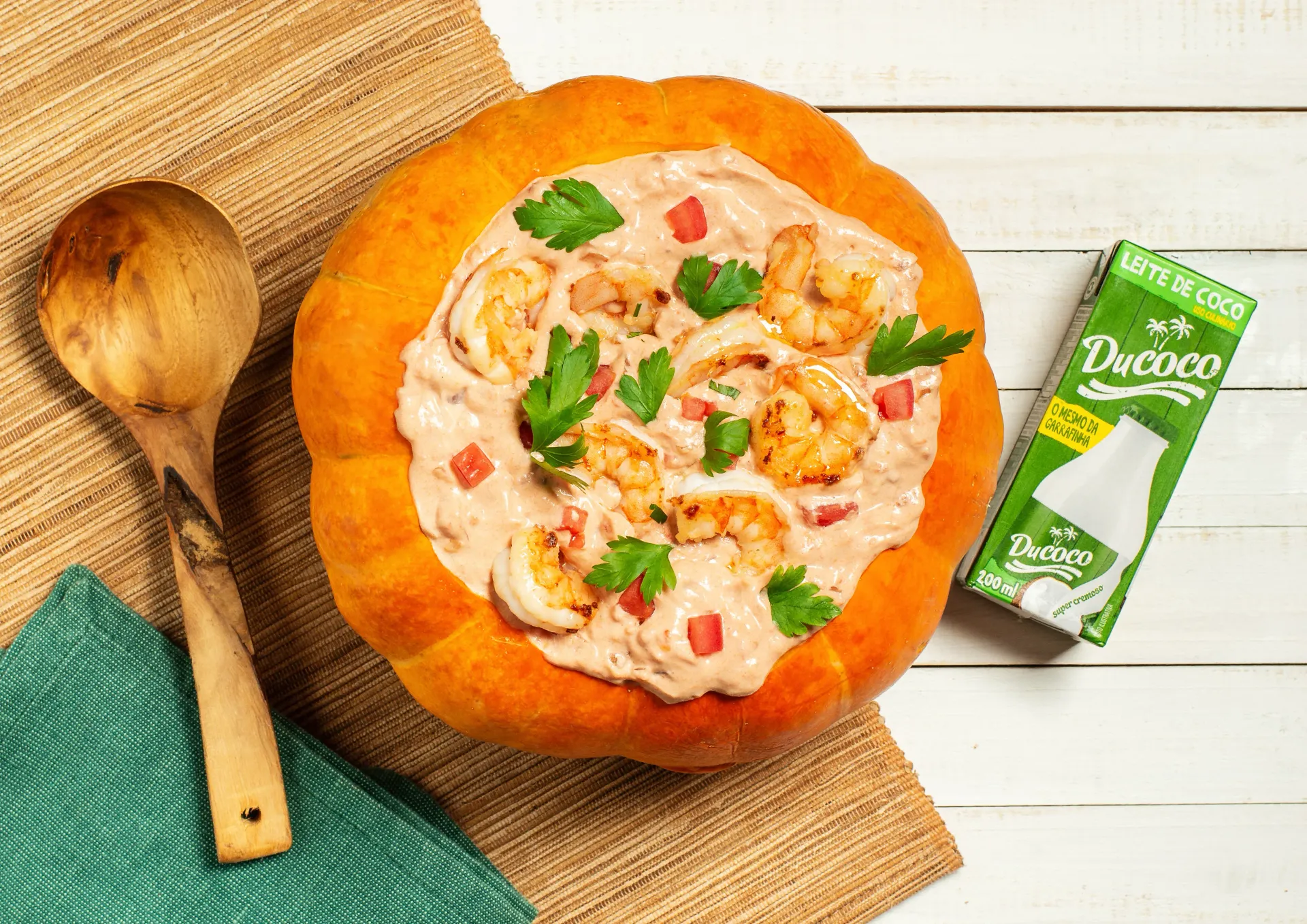 - Passe um pouco de requeijão no interior da moranga e despeje o creme de camarão.